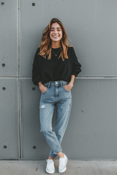 This outfit nails casual chic with a loose black sweater tucked effortlessly into high-waisted, slightly distressed mom jeans. The relaxed fit of the jeans keeps it comfy, while white sneakers bring a fresh, youthful energy to the look. A dainty necklace adds just a touch of sparkle, and the big, genuine smile is the best accessory of all.