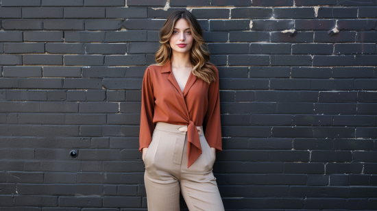 I absolutely love how this outfit feels both daring and approachable. The warm rust shade is so flattering and gives off major “autumn goddess” vibes. The tied blouse shows just enough skin to be flirty without overdoing it, and those jeans? They hug all the right places, making you feel confident and fabulous. This is the kind of outfit you’d wear to a cozy wine bar or an art gallery—anywhere you want to look effortlessly put-together while turning heads.