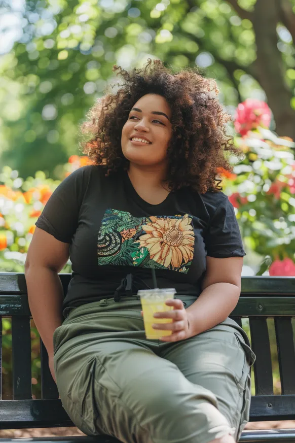 This cute plus-size summer outfit combines comfort with a fun, laid-back style. The black t-shirt features a vibrant, colorful sunflower graphic, which brings a pop of brightness to the simple design. Paired with loose-fitting olive green cargo pants, this outfit offers an effortless vibe, perfect for a sunny day out. The casual style is completed with a refreshing drink in hand, making it ideal for relaxing at the park or hanging out with friends.