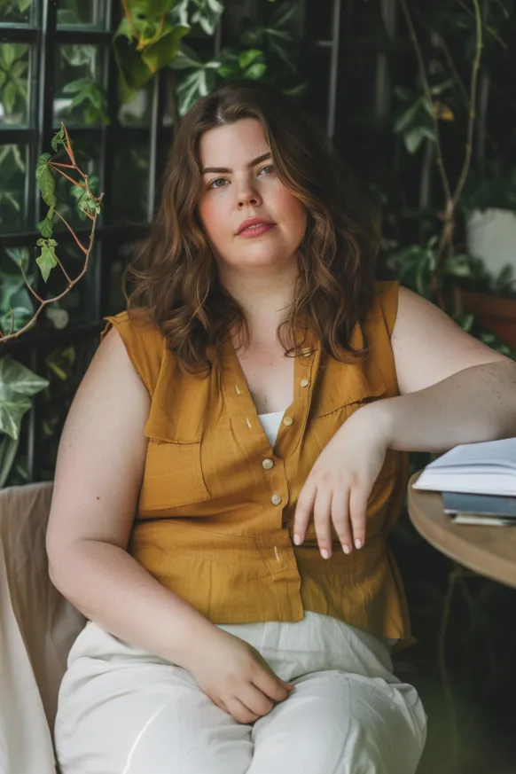 This laid-back yet chic outfit pairs a mustard yellow button-up top with relaxed cream-colored pants, making it perfect for a casual summer day. The sleeveless top adds a breezy, comfortable feel, while the subtle button details keep it polished without feeling too formal. The cream pants are light and flowy, creating an effortless and breathable look that’s perfect for warmer weather. The outfit is finished with a casual yet stylish vibe, making it ideal for running errands, meeting up with friends, or just relaxing at home.