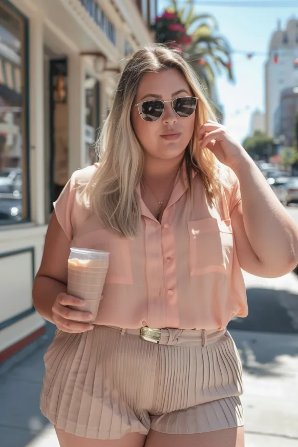 This effortlessly chic summer outfit features a soft blush-colored button-up blouse paired with pleated beige shorts, offering the perfect balance of comfort and sophistication. The blouse has a relaxed fit, with a subtle sheen that catches the light, making it look polished yet casual. The pleated shorts add structure to the outfit, while the belted waist ensures a flattering silhouette. Paired with stylish sunglasses and a refreshing iced coffee, this outfit is ideal for a sunny day in the city.