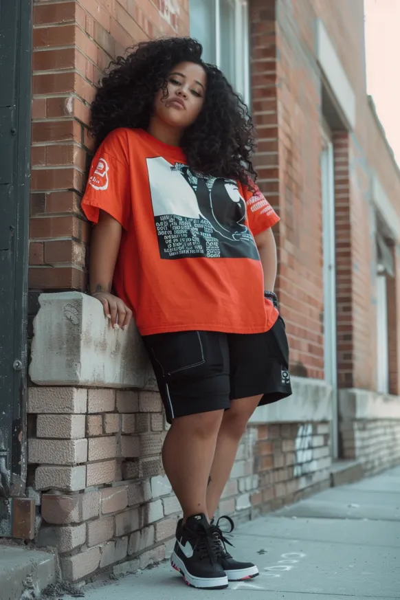 This fun and bold plus-size summer outfit combines street style with a relaxed vibe. The standout piece is a vibrant red oversized graphic t-shirt with bold text and an artistic print, adding a pop of color and personality to the outfit. Paired with black shorts that feature side pockets and sporty details, the look is comfortable and casual. The outfit is completed with a pair of classic black and white sneakers, perfect for a day of running errands or hanging out with friends.