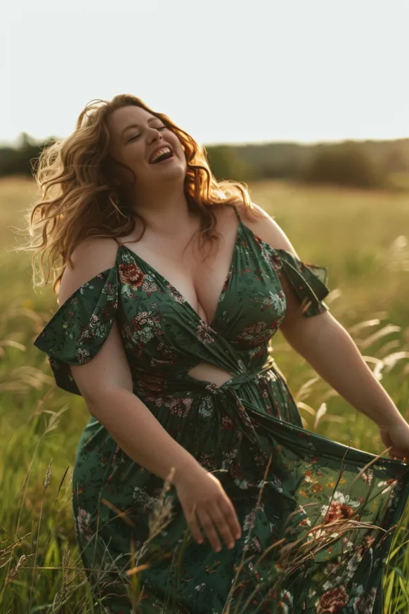 This gorgeous plus-size summer outfit features a stunning green floral wrap dress that embodies a playful, feminine vibe. The dress has a flattering v-neckline, with ruffled off-the-shoulder sleeves that give it a touch of romance. The tie at the waist accentuates the curves and creates a lovely silhouette, while the flowing skirt moves beautifully with each step. Perfect for warm weather, this dress offers both comfort and style, making it ideal for outdoor events or casual gatherings.