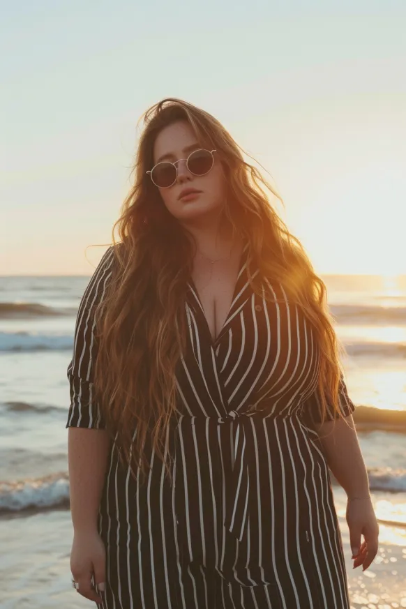 This fabulous plus-size summer outfit features a black and white striped jumpsuit, making it an eye-catching piece for any occasion. The jumpsuit is designed with a deep v-neckline and a tie at the waist, giving it a flattering silhouette while still being incredibly comfortable. The wide, flowing fabric allows for ease of movement, and the bold stripes create a sleek, elongating effect. Paired with simple sunglasses and a beachy vibe, this look is perfect for a sunny day by the ocean or a casual outing.