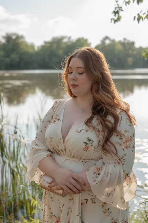 This plus-size summer outfit is perfect for a romantic and effortless look. The soft, flowy maxi dress features a delicate floral pattern in muted tones, with a plunging neckline and voluminous bell sleeves that create an elegant yet relaxed vibe. The dress is cinched at the waist with a tie belt, accentuating the figure while maintaining a comfortable, breezy fit. Its soft fabric gently flows with each movement, making it perfect for outdoor gatherings or a serene walk by the water.