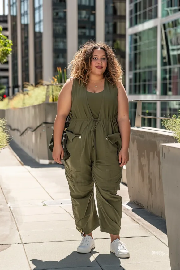 This olive-green utility jumpsuit is a perfect blend of practicality and style, with its relaxed fit and stylish details. It features a zip-up front, oversized pockets, and an adjustable waist, making it not only fashionable but functional too. The soft fabric allows for all-day comfort, and when paired with simple white sneakers, the look is both sporty and chic. The simple design of the jumpsuit is elevated by the matching olive-green tank underneath, making it an effortlessly stylish outfit for the summer.