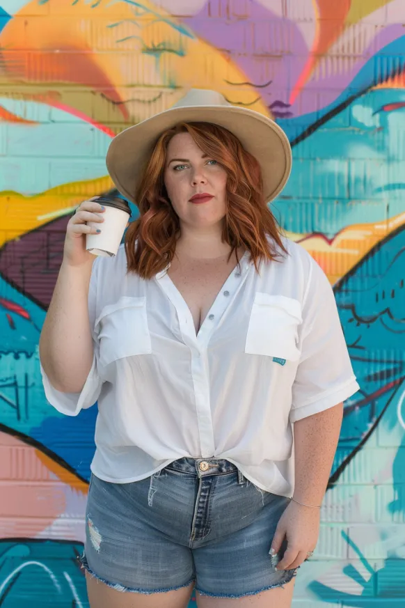 This chic summer outfit is a blend of simplicity and style. The loose-fitting white button-down shirt adds a breezy, laid-back vibe, while the rolled-up sleeves give it an extra touch of cool. Paired with distressed denim shorts, the look feels effortlessly casual and fun. The wide-brimmed hat is a perfect accessory, providing both shade and style, while the coffee in hand adds a little personality to the ensemble. The look is completed with a laid-back yet fashionable attitude.