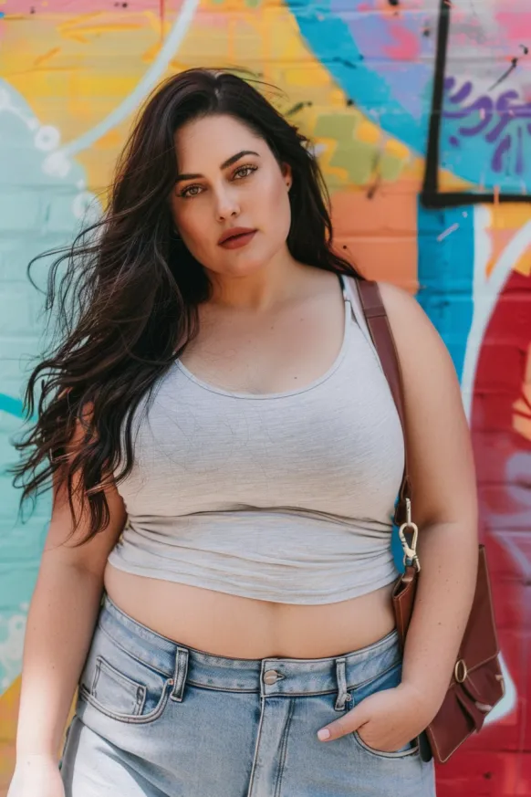 This outfit is the epitome of casual cool—a simple gray tank top paired with high-waisted denim shorts. The tank is perfectly fitted, creating a relaxed yet flattering silhouette. The light wash denim shorts are slightly distressed, adding a trendy edge to the look. To complete the outfit, a cute crossbody bag is worn for practicality and style, while a bold statement in the background adds a pop of color to the whole vibe.