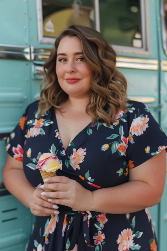 This chic plus-size summer outfit features a beautiful floral wrap dress, perfect for any casual outing or summer day adventure. The dress combines a deep navy base with vibrant floral patterns in shades of orange, yellow, and green. It has a flattering wrap-around design that cinches at the waist, creating an hourglass shape while keeping things comfortable and breathable for those hot days. The subtle v-neckline adds a touch of elegance, while the flowy skirt makes it easy to move around in.