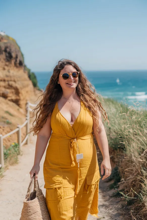 This stunning plus-size summer outfit is all about laid-back beachy vibes. The mustard yellow dress features a deep v-neckline with a tie at the waist, allowing for a customizable fit that accentuates your curves. The fabric is light and airy, perfect for staying cool while looking stylish on a sunny day. With its relaxed silhouette and slightly flared bottom, the dress flows effortlessly as you walk, giving off a carefree boho look. A woven straw tote and sunglasses finish off the ensemble, adding the perfect beachy touch.