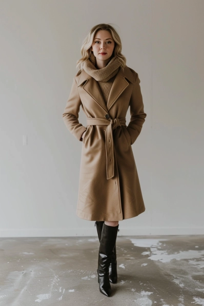 Is there anything more effortlessly chic than a camel coat? This look takes it up a notch with a tailored, belted camel coat that cinches the waist in all the right places. It’s paired with a chunky knit scarf in a coordinating neutral tone, adding that perfect touch of coziness. The knee-high black boots bring a little bit of drama while keeping the look sleek and polished. This outfit is basically winter date night goals—classic, cozy, and oh-so-sophisticated.