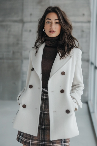 This outfit is a perfect mix of preppy charm and winter elegance. The crisp white double-breasted coat creates a striking contrast with the rich brown turtleneck sweater underneath. The plaid skirt brings a playful, retro vibe while still looking sophisticated, making the outfit feel well-balanced. The combination of neutral tones is both warm and chic, ideal for winter, while the structured coat adds a polished touch to the overall look.