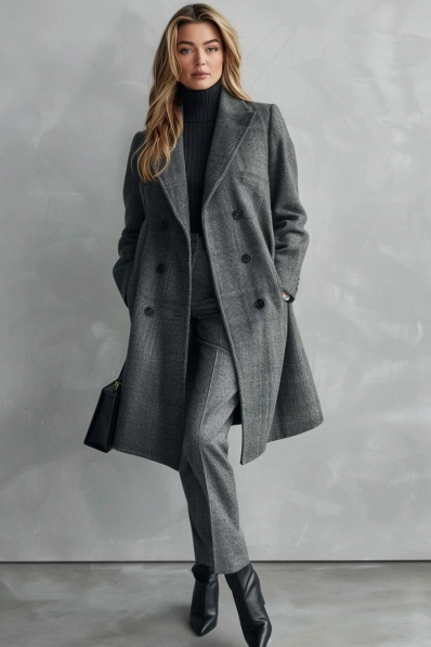 This look is a masterclass in winter power dressing. The tailored gray suit features perfectly fitted trousers and a sleek matching blazer, layered underneath a long, structured gray coat. The monochromatic palette of different gray tones gives the outfit a sophisticated, cohesive feel. Paired with a dark turtleneck sweater and sharp black ankle boots, this ensemble strikes the perfect balance between professional and stylish. A small black handbag adds just the right touch of elegance to this stunning outfit.