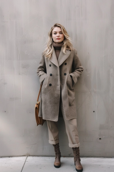 This outfit brings all the cozy vibes with its mix of earthy tones and relaxed yet chic style. The taupe double-breasted coat is perfectly layered over rolled-up beige trousers, creating a laid-back look that’s still put-together. The brown lace-up boots add a practical, outdoorsy touch while keeping the whole outfit effortlessly stylish. Paired with a turtleneck sweater and a brown shoulder bag, this ensemble is ideal for a casual winter date where comfort and warmth are key.