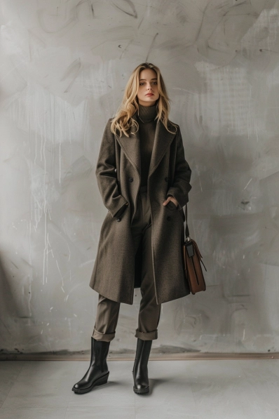 This monochromatic olive green outfit is a perfect example of how to stay effortlessly stylish in the winter. The long olive coat drapes beautifully over a matching turtleneck and trousers, creating a sleek and cohesive look. The rolled-up pant hems give a subtle nod to casual styling, while the black leather ankle boots add just the right amount of edge. With a structured brown handbag as the finishing touch, this outfit strikes the perfect balance between sophisticated and laid-back.