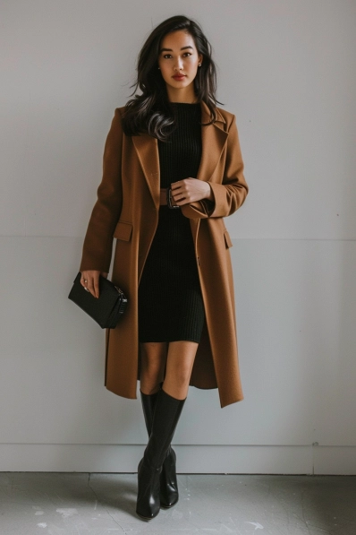 I’m totally obsessed with the contrast in this look. The camel coat brings so much warmth and depth, and paired with a black dress, it’s a combination that never fails to impress. The ribbed texture of the dress adds a little interest without being too flashy, and those boots? Absolute perfection for winter—they add just the right amount of drama while still looking polished. It’s such a versatile outfit, too—perfect for a dinner date or an evening out, and you’ll look like a total style icon without even trying!