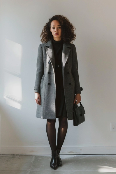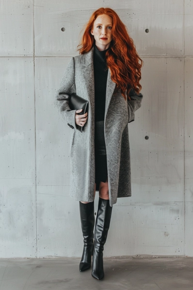 What I love most about this look is how effortless yet striking it feels. The gray coat is the perfect neutral base, allowing the black dress and boots to shine while adding warmth and style. It’s a balanced mix of comfort and chic, ideal for a night out when you want to look polished but not overdone. The knee-high boots give the outfit just the right amount of attitude, making this ensemble perfect for both a cozy dinner or a more formal evening event. It’s the kind of outfit that looks timeless and stylish without even trying too hard!