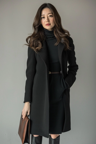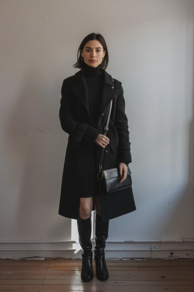 Nothing says sleek and sophisticated quite like an all-black ensemble. This look features a long black coat draped effortlessly over a chic black turtleneck dress. The subtle belt at the waist adds just a touch of structure to the look, keeping everything sleek yet defined. Finishing touches like knee-high black boots and a minimalist leather clutch make this outfit perfect for a winter evening when you want to look effortlessly polished. It’s one of those outfits that screams elegance without even trying.