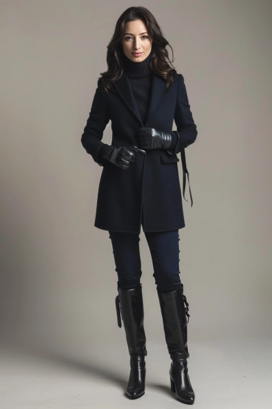 This outfit is giving us major sleek and chic vibes! The structured black coat with its tailored silhouette pairs perfectly with a turtleneck sweater underneath—hello, cozy warmth without sacrificing style! Slim-fitting black pants keep everything streamlined, while those knee-high leather boots add a touch of edge. Topping it off, the black leather gloves give the whole ensemble a polished, sophisticated finish, perfect for a classy winter date night where you want to look put-together but still keep warm.