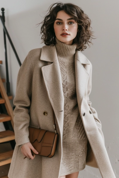 What I absolutely adore about this look is how it takes a neutral palette and makes it feel so luxurious. The matching tones of the coat and dress create a unified, chic aesthetic, and the texture of the knit dress adds just the right amount of visual interest. It’s one of those outfits where you feel super comfortable, but still look like you put a lot of thought into it. Perfect for when you want to feel cozy and stylish at the same time—this is winter date night perfection!