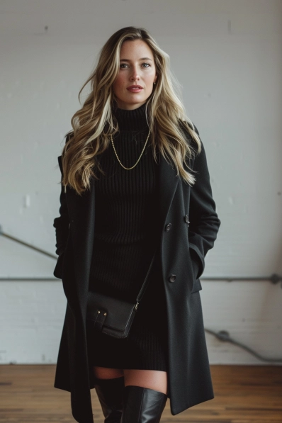 This look is the definition of sleek winter sophistication. The double-breasted black coat gives off a polished, tailored vibe with its sharp lines and structured silhouette. Underneath, a black turtleneck dress keeps the look monochromatic and effortlessly chic. The knee-high black boots add a dash of edginess and elongate the legs, while the small black handbag ties the whole outfit together. This ensemble is perfect for a classy evening out when you want to be stylish but still keep it simple and warm.