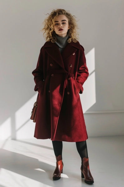 This outfit brings a pop of color to winter fashion with a stunning burgundy coat that’s both eye-catching and classy. The coat’s double-breasted design and cinched waist create a flattering silhouette, while the gray turtleneck underneath keeps the look balanced and cozy. Paired with black tights and sleek brown ankle boots, this ensemble is perfect for a winter date when you want to add a little boldness to your look without sacrificing comfort.