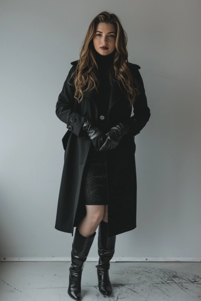 This all-black outfit radiates confidence and sophistication with an edgy twist. The long black coat adds structure and elegance, while the fitted black dress underneath keeps the look sleek and figure-flattering. The knee-high black leather boots and matching black gloves give the outfit a bold, modern edge, perfect for making a statement on a winter date night. The all-black palette adds an air of mystery and power, making this look unforgettable.