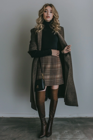 I just adore how this look combines timeless pieces in such a fun way! The plaid skirt keeps things fresh and playful, but the knee-high boots and long coat make sure you’re not freezing out there. It’s like you’re channeling both your inner fashionista and your practical side at once! Plus, that crossbody bag is not only cute but super convenient—perfect for keeping your hands free for holding a hot chocolate (or your date’s hand!). This outfit definitely gives off those “I put effort in, but not too much effort” vibes, which we all know is the sweet spot!