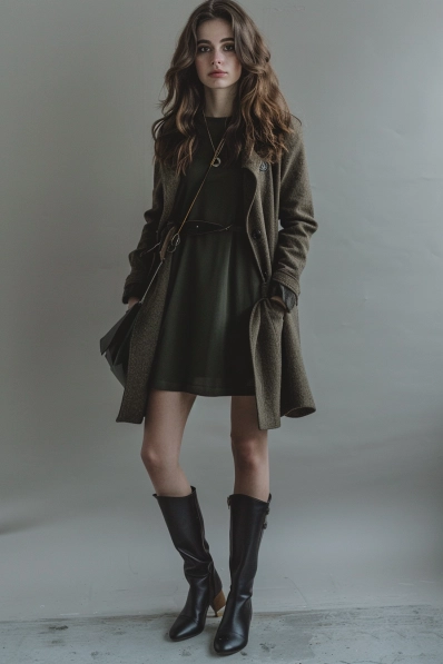 This outfit is giving off cozy yet sophisticated vibes! The olive green dress is the perfect base, with a flattering belted waist that gives the whole look shape and definition. The tailored coat, with its rich brown tones, adds warmth and structure, making it ideal for a chilly winter date night. Black knee-high boots round out the look, adding a touch of edginess while keeping things practical for colder weather. It’s a perfect mix of comfort and style—casual enough for a laid-back evening, but dressy enough to turn heads.