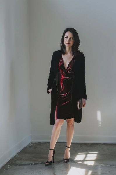 This outfit is all about bringing the wow factor! The deep red velvet dress is absolutely stunning with its luxurious texture and flattering wrap design that accentuates the waist. It’s the kind of dress that’s soft to the touch but makes a big visual impact. Over it, a sleek black coat adds that necessary winter layer while keeping the overall look elegant and sophisticated. Pairing it with black strappy heels and a simple clutch, this outfit is perfect for a fancy winter date night when you want to look your absolute best.