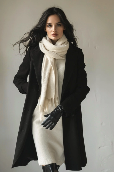 What I love about this outfit is how timeless it feels. You can never go wrong with a black-and-white color palette, especially in winter. The white dress feels so soft and cozy, while the black coat and accessories give the outfit structure and polish. Plus, that scarf looks like the coziest thing ever! It’s the perfect way to stay warm while still looking put-together. This is one of those outfits where you can walk into any room and instantly feel chic—without even trying too hard.