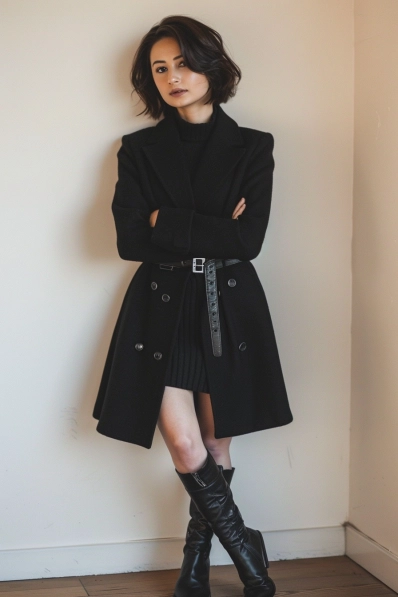 This look is a total power move for winter! The fitted black coat, cinched at the waist with a sleek belt, creates a strong, structured silhouette. Paired with a pleated black skirt, the outfit has just the right amount of feminine flair without losing its edgy vibe. The knee-high black leather boots pull everything together for a streamlined look that’s both chic and a little bit fierce. It’s the perfect choice for a winter date night where you want to show off some attitude while staying warm.