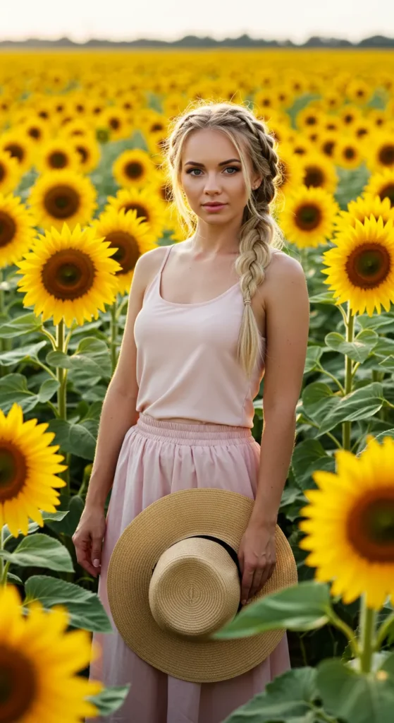 This outfit is perfect for a sunny day spent outdoors, and it radiates effortless summer charm. The soft pink tank top is paired with a flowy, lightweight skirt that moves beautifully in the breeze, giving the outfit a feminine, airy feel. The addition of a stylish straw hat complements the look, making it ideal for enjoying nature or strolling through a sunflower field. Simple yet chic sandals complete the outfit, keeping it comfortable and practical.