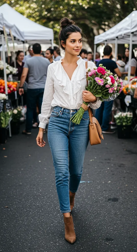 This outfit is a perfect blend of casual comfort and effortless style, ideal for a fun day out at the market or grabbing a coffee with friends. The white ruffled blouse adds a touch of femininity, while the high-waisted, skinny jeans keep it grounded and practical. The tan ankle boots give the outfit a chic edge, and the small handbag is both functional and stylish. Holding a bouquet of fresh flowers just completes the look, adding an extra pop of color and charm.