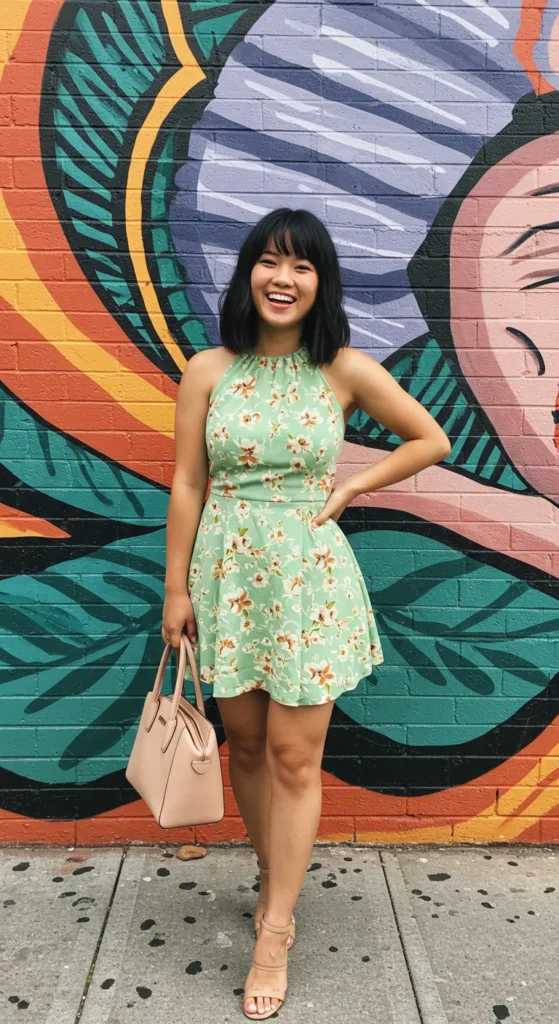 I absolutely adore how fresh and fun this outfit looks! The soft green hue is so refreshing and totally perfect for summer. The floral pattern adds a playful, youthful touch while keeping it stylishly simple. This dress is one of those pieces you can wear and feel effortlessly chic without much thought, and I love how it pairs so well with the neutral accessories. It’s ideal for those days when you want to look cute but keep things easy and comfortable. It’s truly a dress that makes you feel as vibrant as the summer season itself!