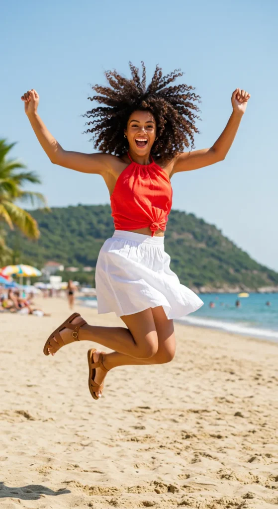 This look is peak summer happiness. The halter-style red crop top brings all the fun and energy with its bold color and playful front tie. Paired with a breezy white high-waisted skirt, it gives off the ultimate carefree beach girl energy. The brown flat sandals keep the look grounded and comfortable, perfect for walking on sand or grabbing ice cream on the boardwalk. Everything about this outfit screams sun, saltwater, and good vibes.