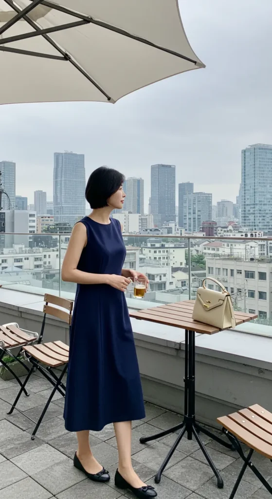 This outfit is a whole vibe for those summer days when you want to look polished but still feel totally at ease. The sleeveless navy midi dress is sleek, simple, and totally timeless. With its clean lines and modest cut, it flatters the figure without trying too hard. Paired with classic black ballet flats and a structured cream handbag, it’s giving major modern city chic. The minimal accessories let the dress speak for itself, and the whole look feels quietly confident and put-together.