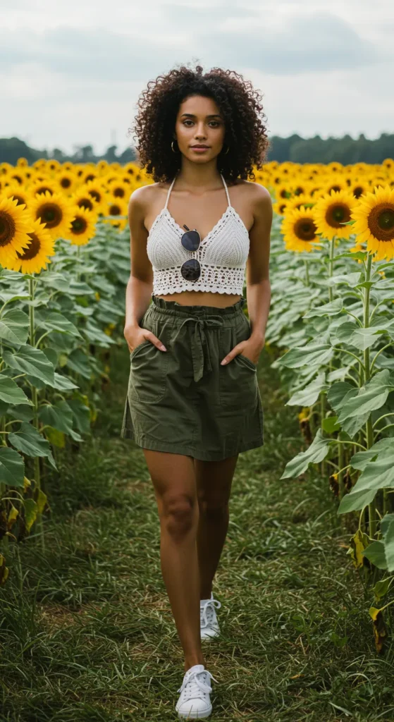 This outfit combines the perfect mix of bohemian vibes and casual comfort. The white crochet halter top adds a playful, textured element, while the olive green skirt keeps things relaxed and stylish. The skirt’s drawstring waistband makes it easy to wear, offering both style and functionality. Paired with white sneakers, this look is both practical and fashionable, ideal for a day spent exploring outdoor festivals or sunflower fields, like the one in the picture.