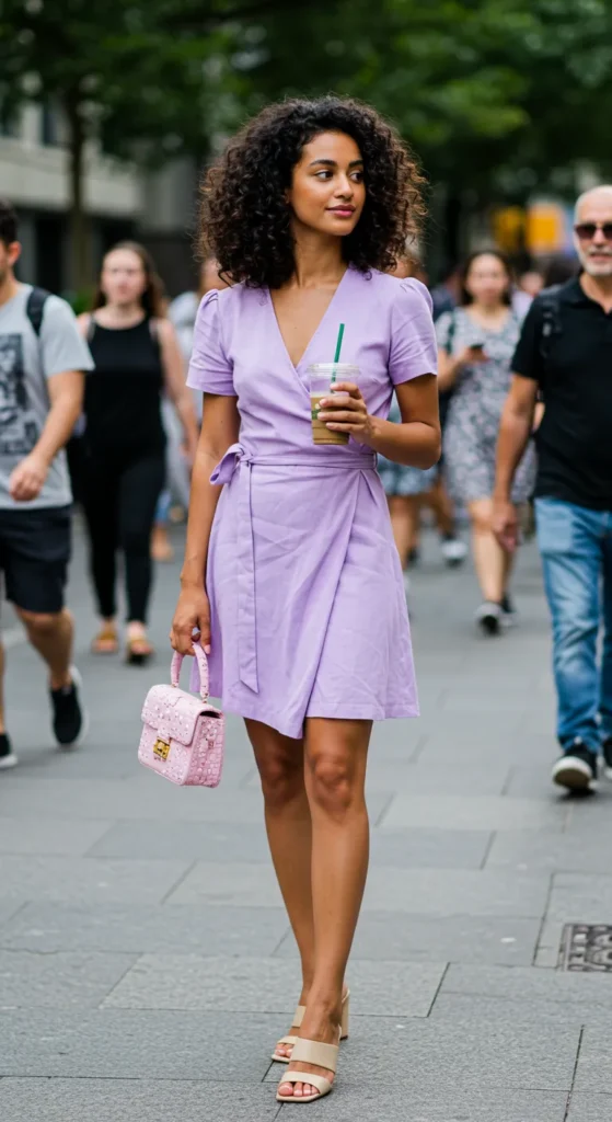 This outfit is all about effortless charm. The short-sleeved lavender wrap dress ties perfectly at the waist, giving it a flattering shape that’s as comfy as it is cute. Paired with neutral block-heeled sandals and a structured pastel pink handbag with gold details, the whole look just screams summer in the city. Add in a cool iced coffee for that ultimate street-style vibe, and you’ve got yourself a fashion moment that’s casual yet put-together.