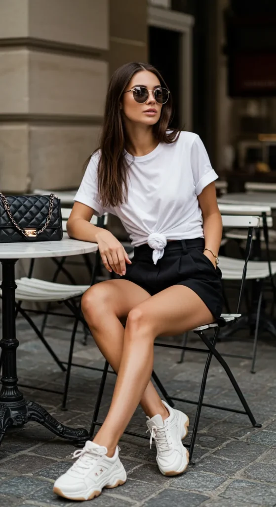 This outfit nails that perfect balance between cool-girl sporty and classic minimalism. A simple white tee is knotted at the waist for a fun, flattering twist, while high-waisted black tailored shorts keep things polished and put-together. Chunky white sneakers add comfort and street-style edge, and the oversized sunglasses and quilted chain-strap bag bring just the right amount of glam to pull everything together.