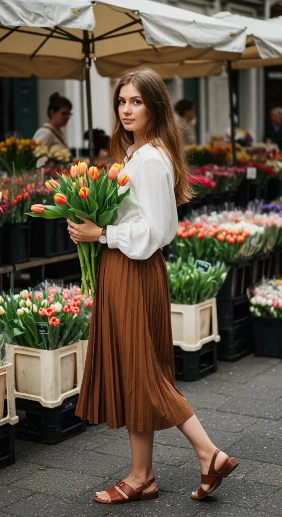This outfit is giving all the romantic countryside feels in the best way possible. The white blouse is light and airy with those subtle balloon sleeves that make it feel a little extra without being too much. Paired with a rich brown pleated midi skirt, the whole look feels soft, flowy and super feminine. The brown leather sandals match perfectly and keep everything comfy and classic while you’re wandering through flower stalls or grabbing fresh produce.