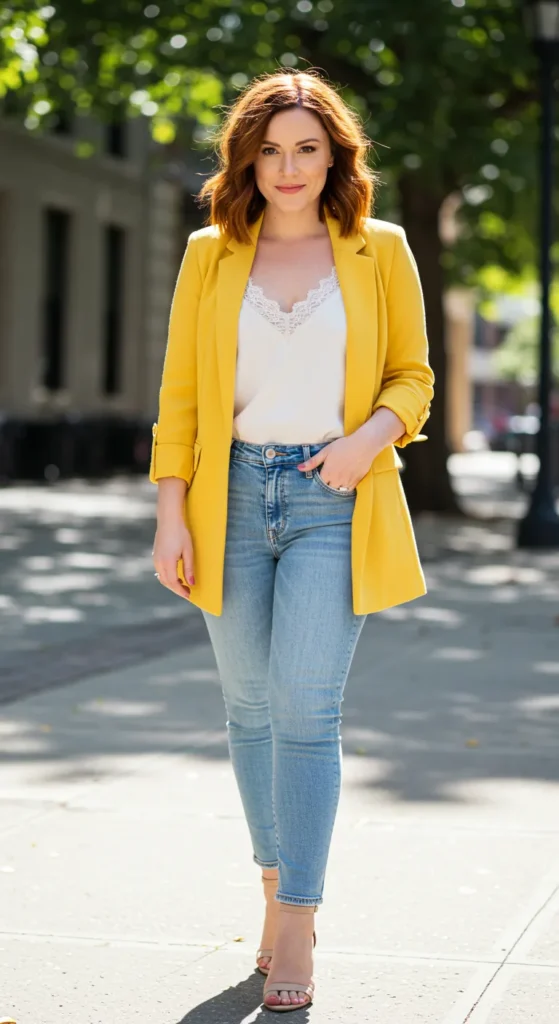This look is bright, playful, and just plain fabulous. The sunny yellow blazer instantly catches the eye and adds a bold pop of color that screams summer energy. Underneath, the white lace-trim camisole keeps things light and feminine, while the high-waisted skinny jeans pull it all together with a clean and classic silhouette. Add in those nude strappy heels for the perfect touch of elegance and you’ve got a whole vibe that works from brunch to casual meetings.