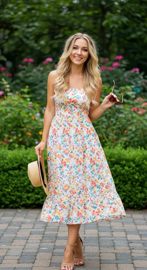 This outfit is all about that effortless summer charm. The strapless midi sundress features a colorful floral print that’s as cheerful as a sunny afternoon in full bloom. The fit-and-flare shape hugs at the waist then flows out into a breezy, ruffled hem that moves so beautifully when you walk. Paired with simple nude sandals and accessorized with classic summer staples like a straw hat and oversized sunnies, this look is basically made for twirling through gardens or strolling at farmers markets.