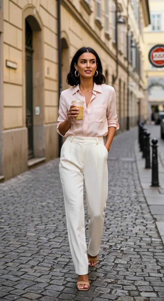 This outfit brings together a refined yet laid-back look that’s perfect for a day out in the city. The soft blush pink blouse is a great choice for a fresh, feminine vibe, and the relaxed fit adds an easygoing touch. Paired with tailored white trousers, the outfit exudes sophistication while keeping it comfortable. Neutral sandals and simple accessories, like large hoop earrings, make this ensemble both stylish and practical for running errands or enjoying a coffee at a local café.