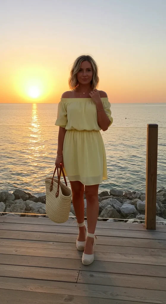 This off-the-shoulder yellow sundress is all about embracing the warmth of summer with a feminine, easygoing style. The light, flowy fabric makes it perfect for a sunny beachside stroll or a casual evening out. Paired with neutral espadrille wedges and a stylish woven bag, the outfit radiates a laid-back yet polished vibe. The soft yellow hue adds a cheerful touch that’s perfect for any outdoor summer activity.