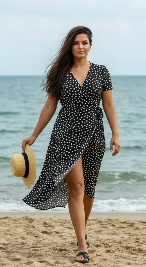 This black and white polka dot wrap dress is the perfect blend of casual chic and fun beach style. The wrap design accentuates the waist and adds a flattering flow, while the high-low hem creates movement with every step. Paired with simple black sandals and a straw hat, this look feels effortlessly stylish for a day at the beach or a sunny stroll by the boardwalk.