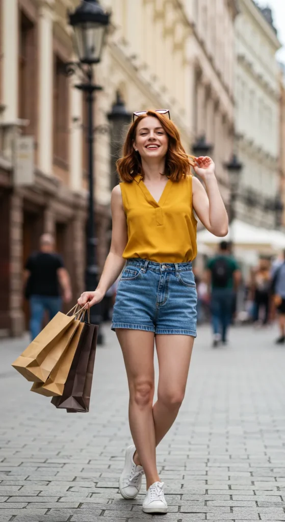 This outfit is a perfect balance of casual and chic for a day out in the city. The mustard yellow blouse adds a pop of color, making it stand out against the classic blue denim shorts. The tucked-in blouse accentuates the high-waisted shorts, giving the whole outfit a polished yet comfortable vibe. Paired with white sneakers, this outfit is practical enough for a day of shopping and exploring the city. Simple accessories and a confident smile complete this stylish, easy-going look.