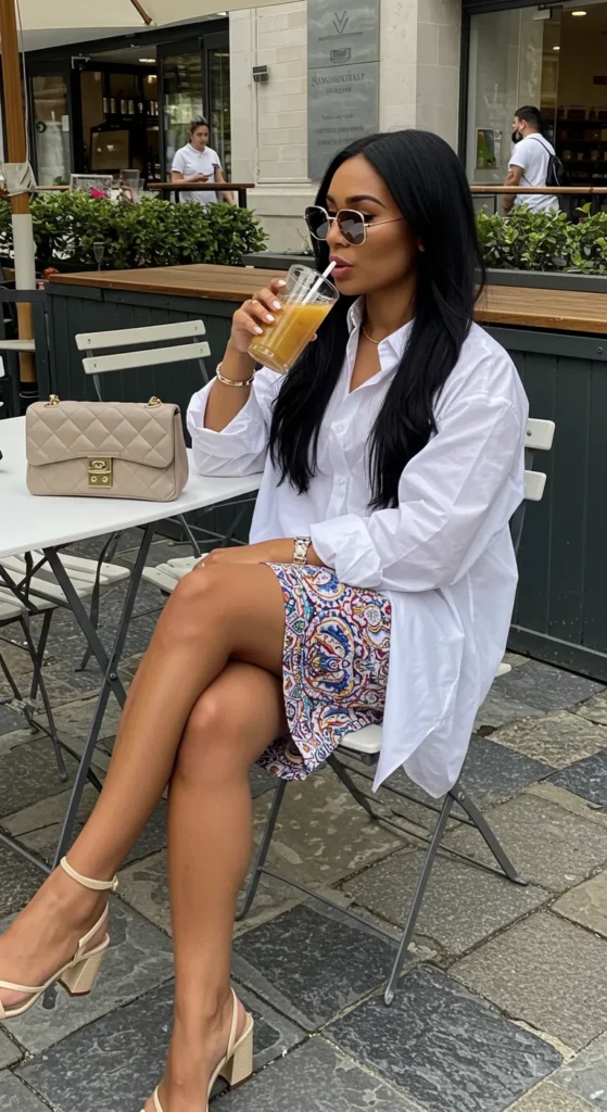 This outfit strikes the perfect balance between casual and chic, ideal for a relaxed café outing or a sunny day in the city. The white oversized shirt is effortlessly stylish, while the colorful skirt adds a fun, lively touch to the look. Paired with neutral heels and a beige handbag, it feels polished without being overdone. The added sunglasses complete the stylish, laid-back vibe, making this look both fashionable and functional.