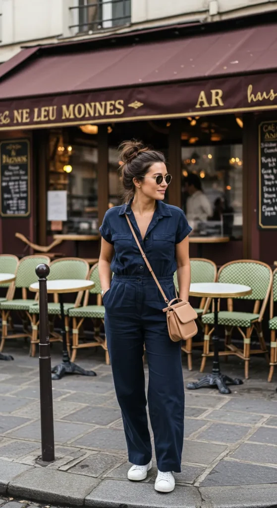 I absolutely love how this outfit nails the balance between laid-back and stylish. It’s perfect for strolling around a European city, enjoying coffee at a café or sightseeing. The versatility of a jumpsuit is unbeatable, offering comfort without sacrificing style. Plus, pairing it with white sneakers just makes it feel effortless, and those accessories add the perfect finishing touches!