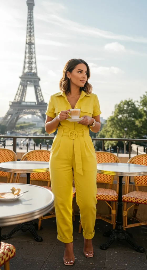 This vibrant yellow jumpsuit is a perfect mix of chic and playful, featuring a fitted waist with a large belt detail for a flattering silhouette. The short-sleeve, button-up design adds a structured element, while the relaxed fit through the legs keeps it comfortable for warm days. Paired with sleek, white heels and simple accessories, this look is effortlessly stylish. The iconic Eiffel Tower in the background makes it an ideal outfit for a café visit or an afternoon of sightseeing in Paris.